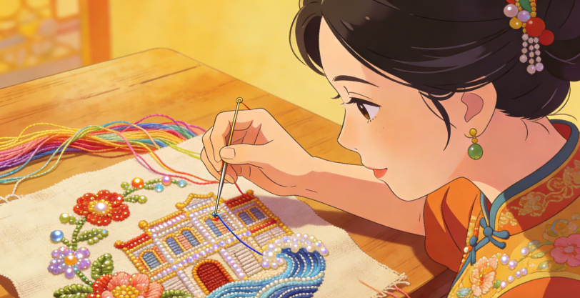 手工串珠技艺,色彩艳丽,工艺精巧,省级非遗。